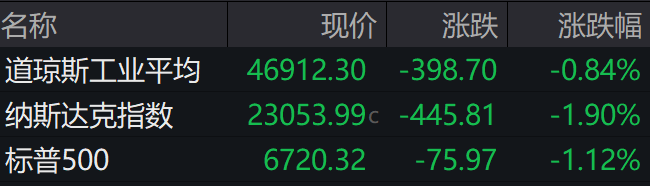 当地时间周四,美股三大股指全线下滑 ,截至收盘,道指跌0.84%,标普500指数跌1.12% ,纳指跌1.90% 。