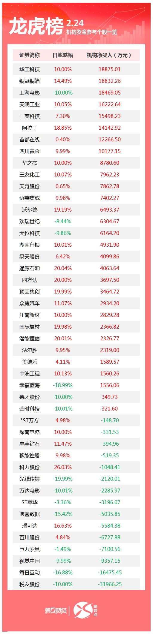 龙虎榜丨机构今日买入这30股,卖出税友股份3.2亿元(2026/02/24)